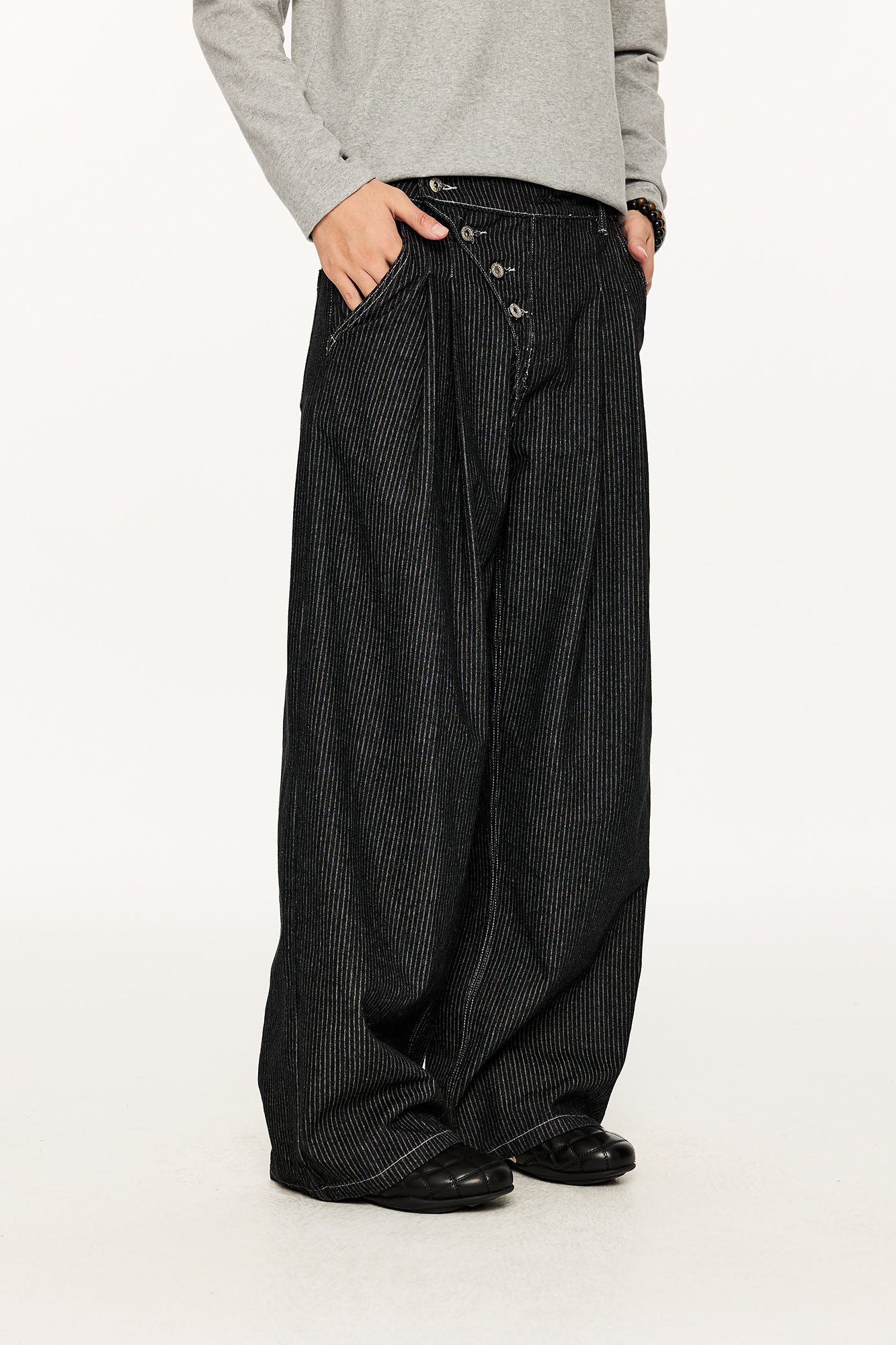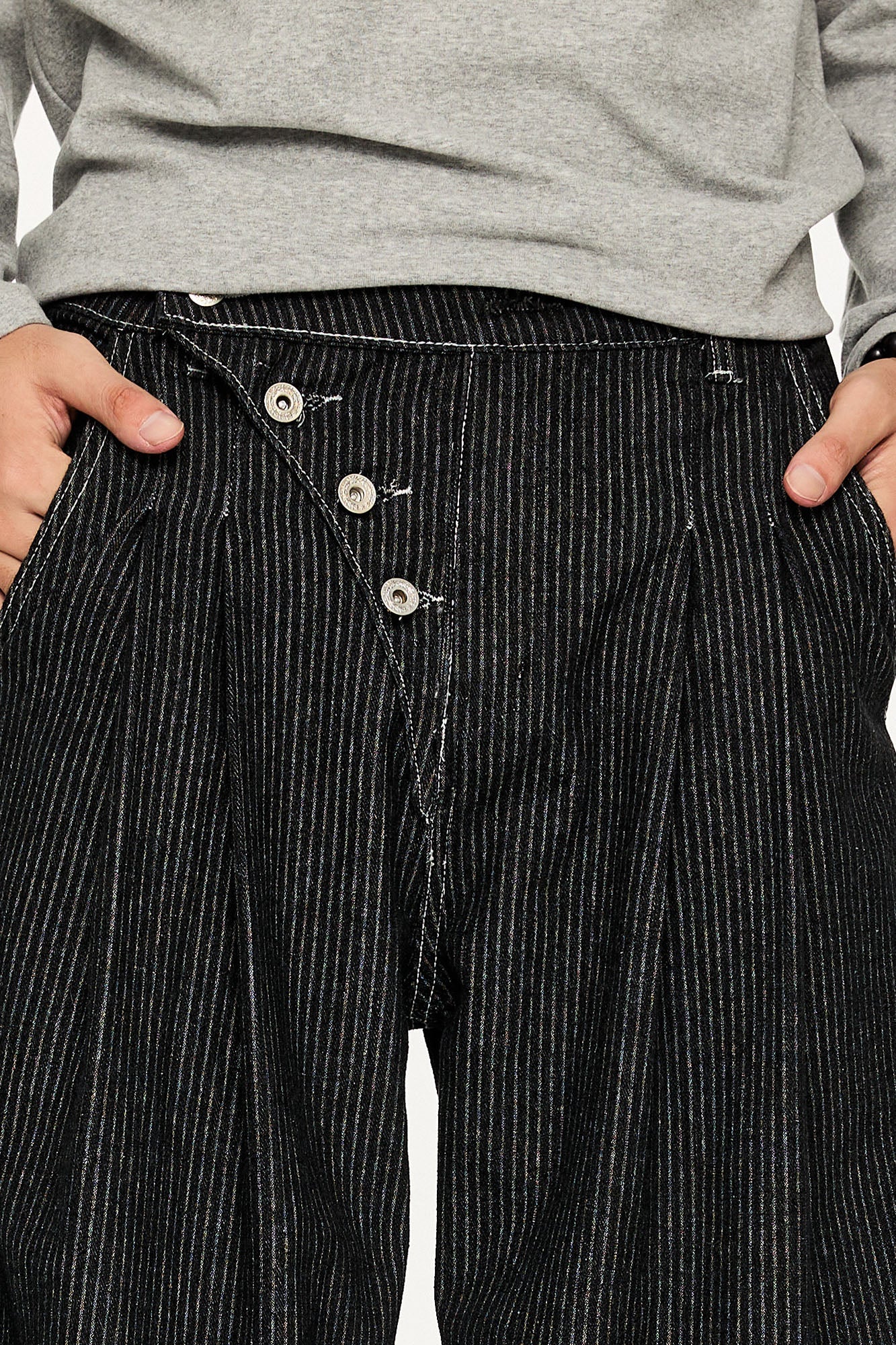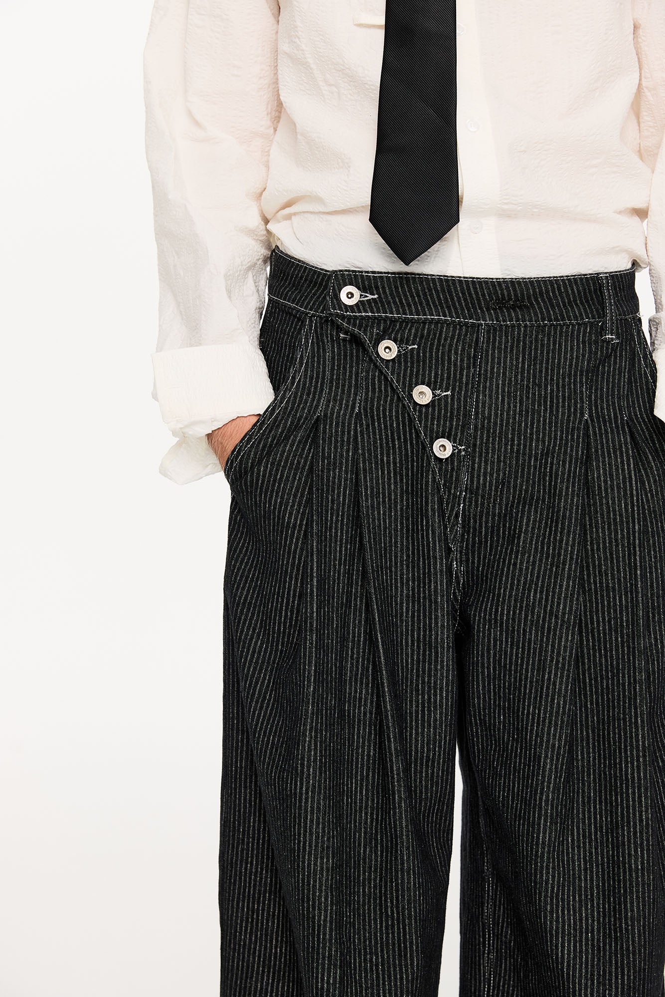 The Asymmetric Button-Up Pleated Jeans introduce architectural detailing to a classic wide-leg silhouette. Defined by diagonal button fastening and deep front pleats, the design creates a structured flow that enhances its relaxed volume. The pinstripe-textured fabric adds a tailored edge, while the elongated cut reinforces its contemporary proportion. Crafted from premium fabric, these jeans embody the balance of precision and ease.