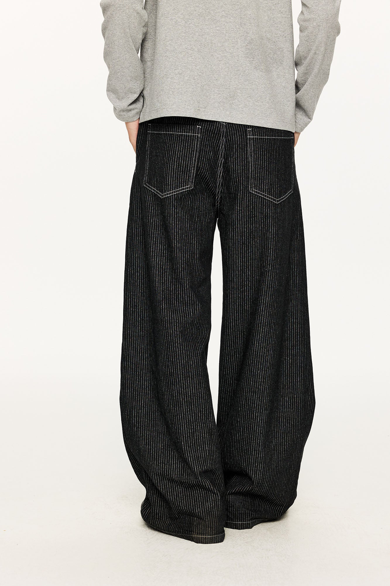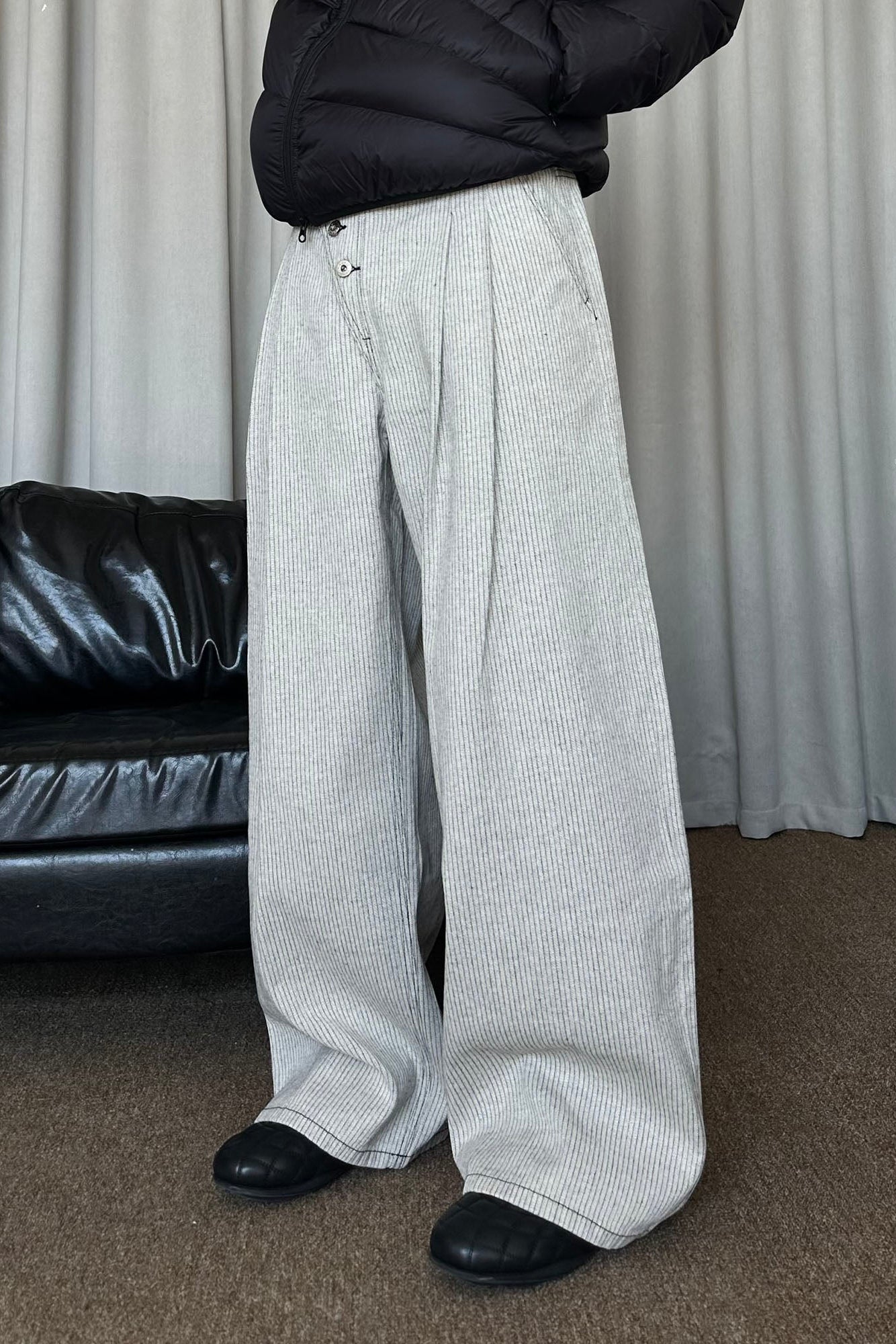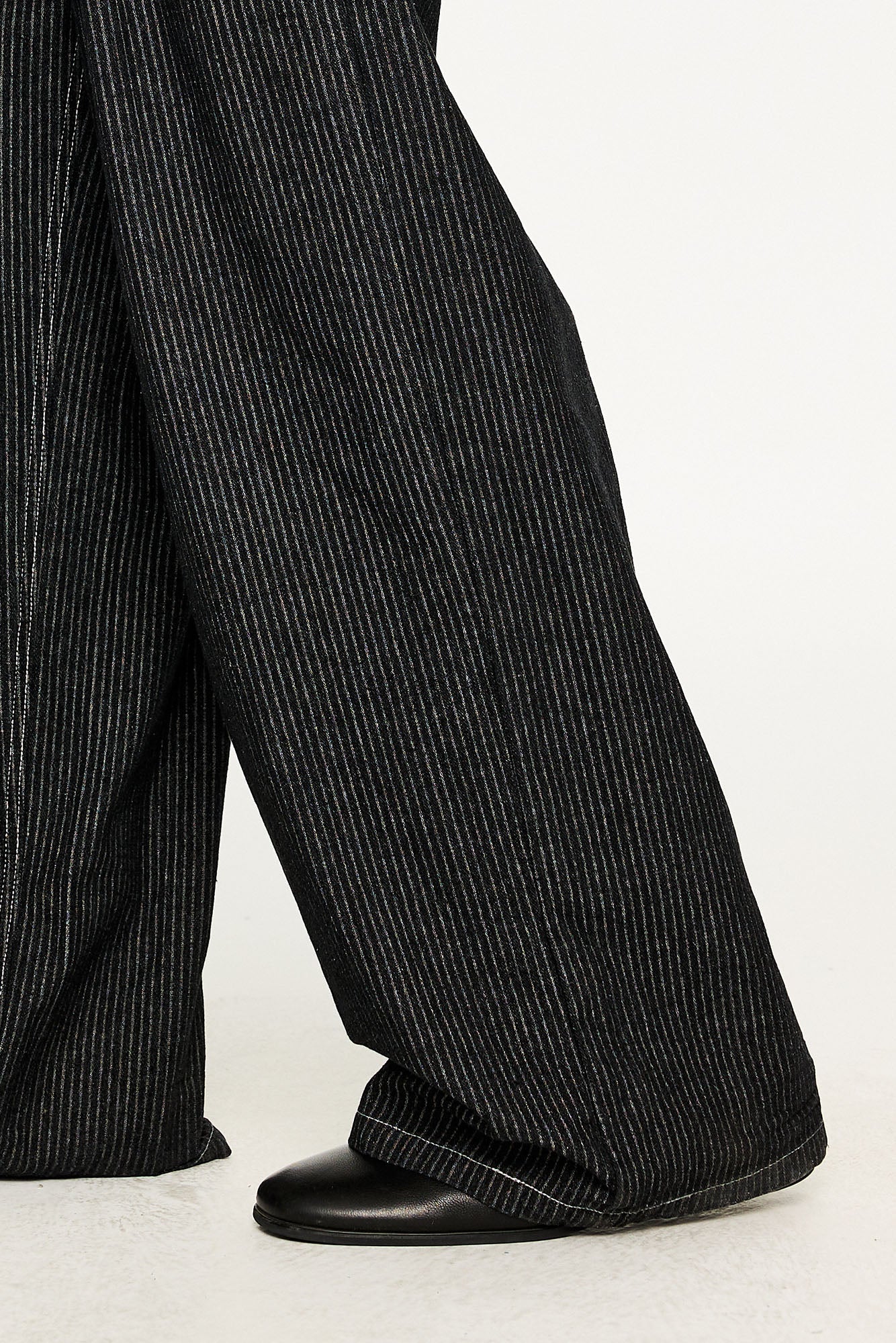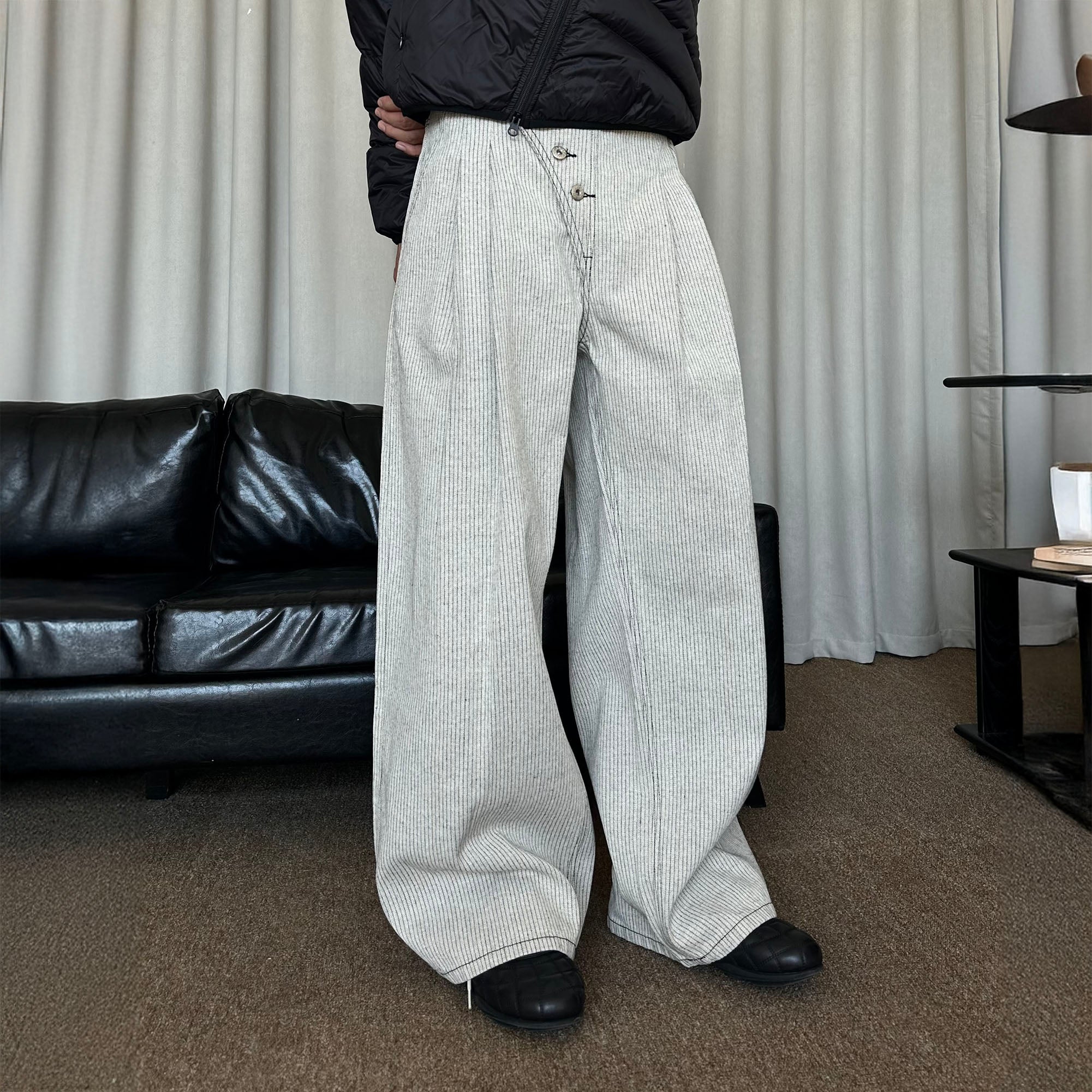 The Asymmetric Button-Up Pleated Jeans introduce architectural detailing to a classic wide-leg silhouette. Defined by diagonal button fastening and deep front pleats, the design creates a structured flow that enhances its relaxed volume. The pinstripe-textured fabric adds a tailored edge, while the elongated cut reinforces its contemporary proportion. Crafted from premium fabric, these jeans embody the balance of precision and ease.
