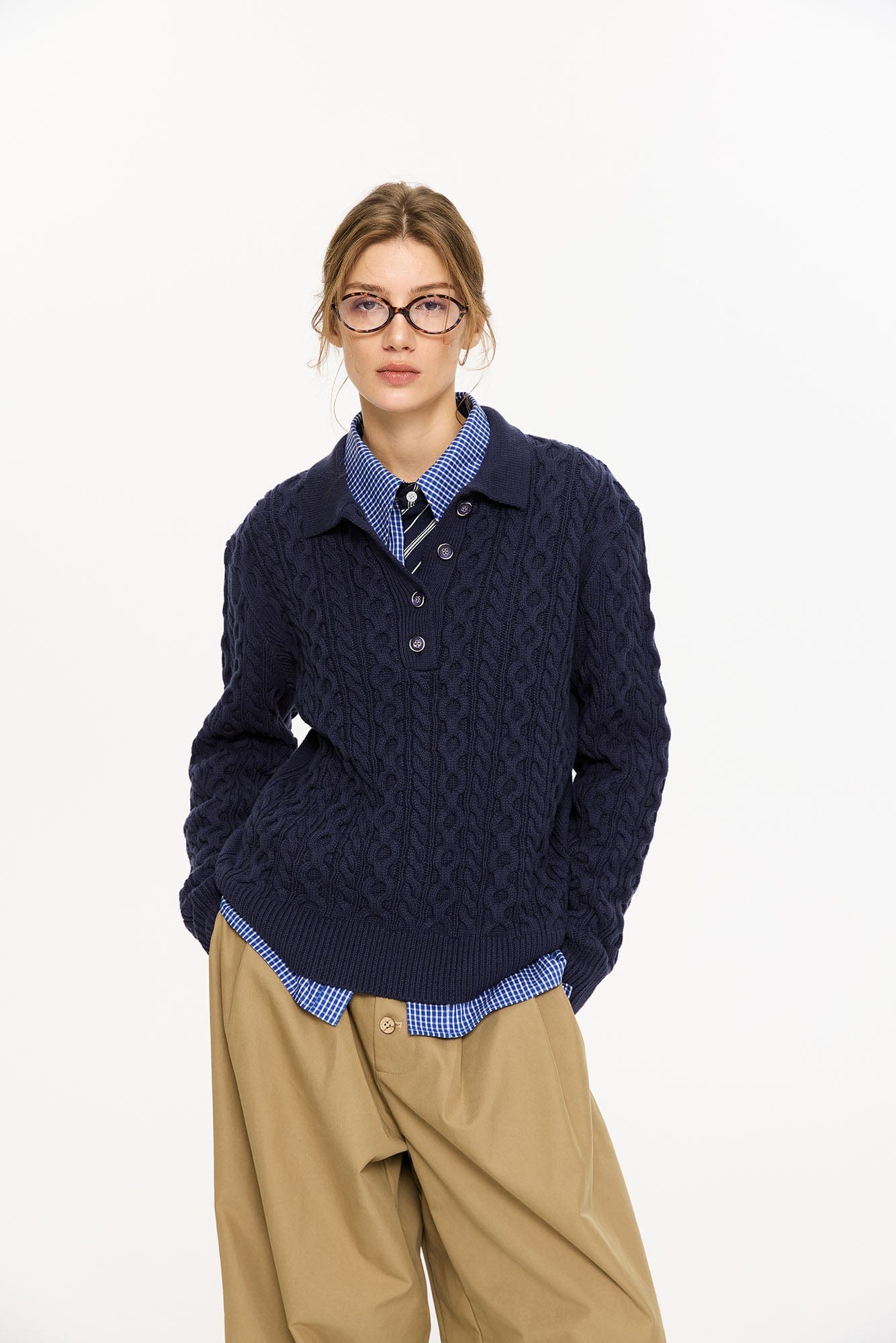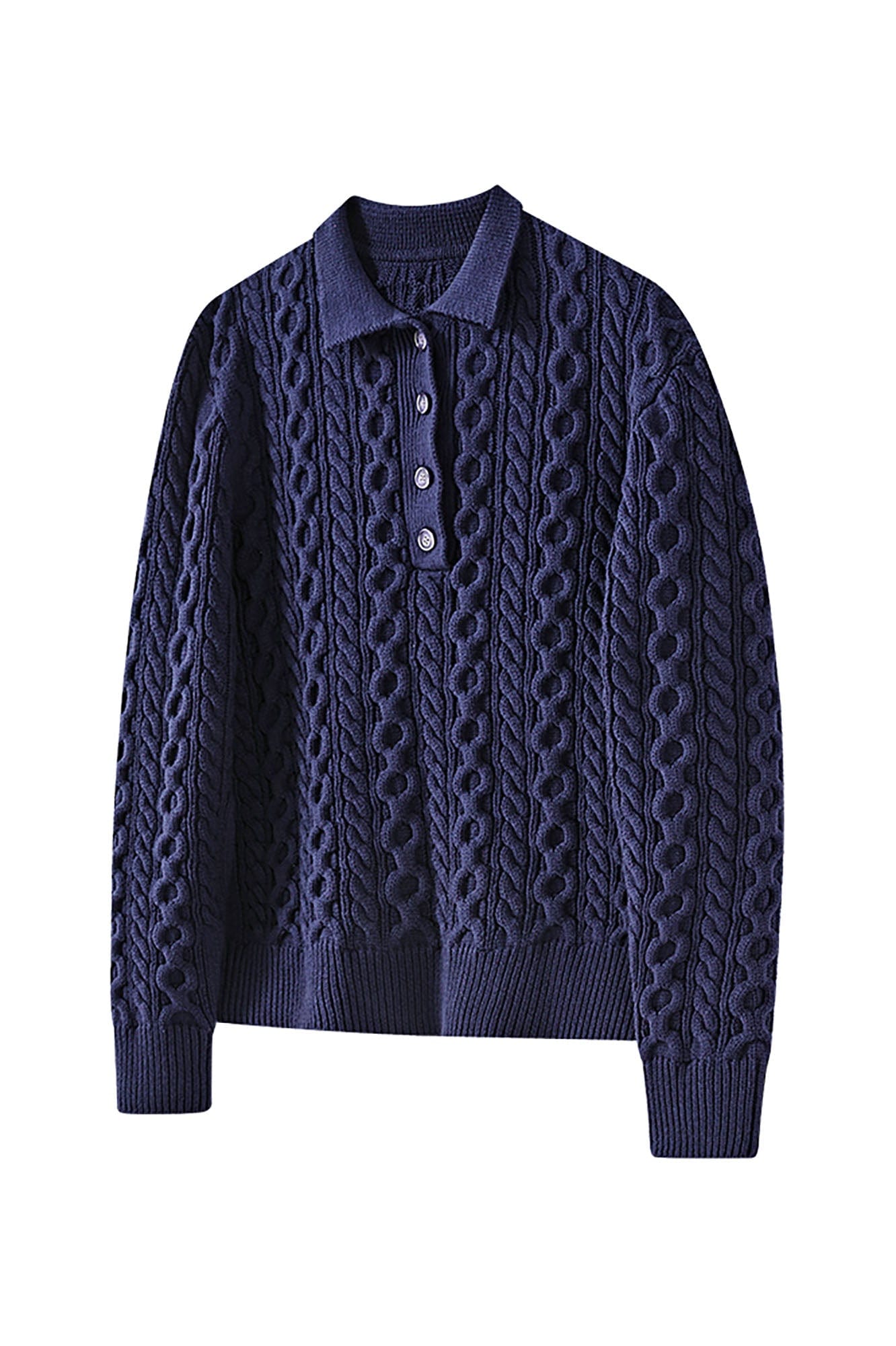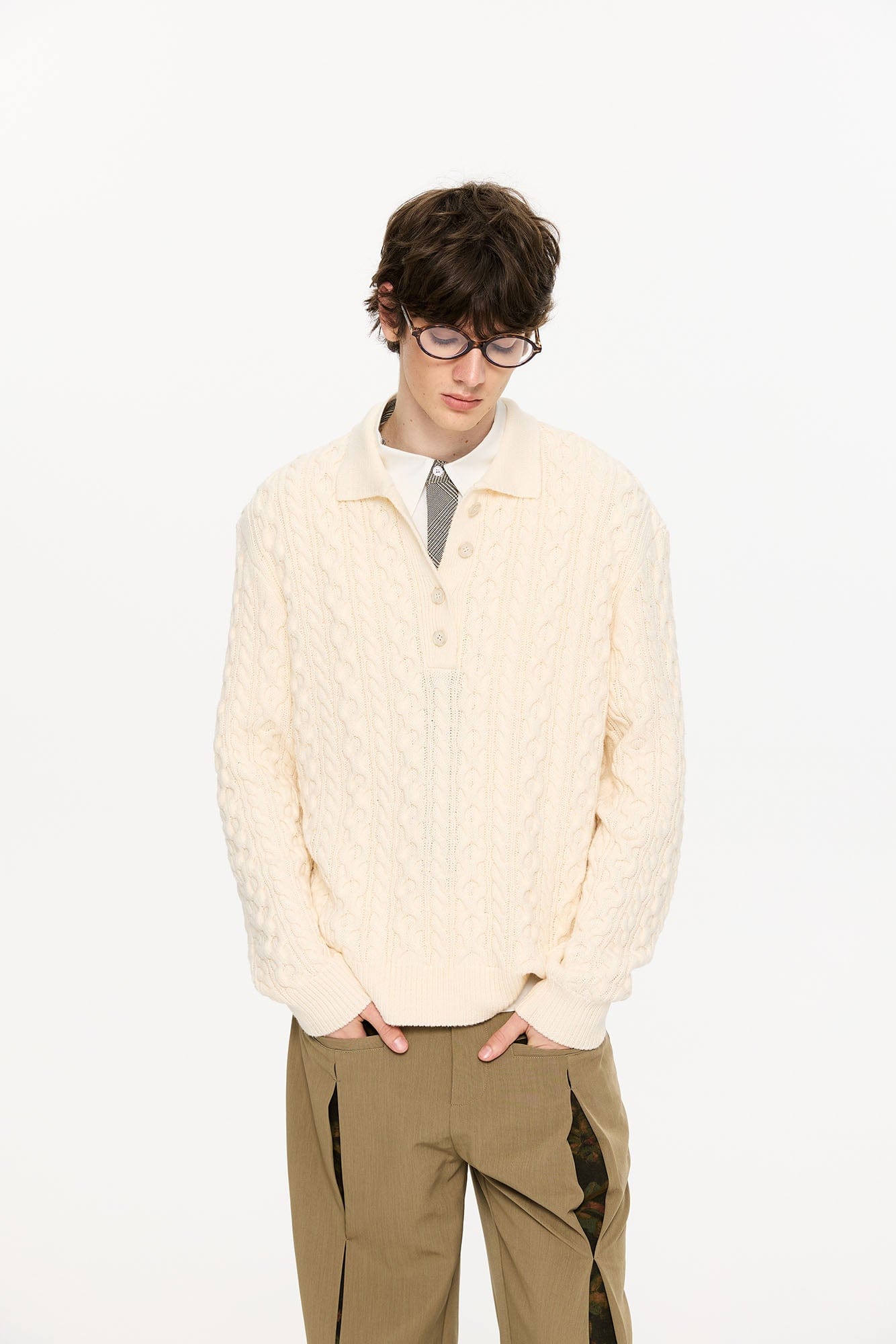 The Cable Knit Polo Sweater bridges collegiate references with a soft sculptural texture. Its traditional cable pattern is reimagined in a slightly oversized frame, anchored by a classic polo collar and buttoned placket. The premium knit construction offers dimensional richness, while ribbed edges at the cuffs and hem bring subtle structure. Understated yet elevated, it layers effortlessly into both relaxed and refined looks.