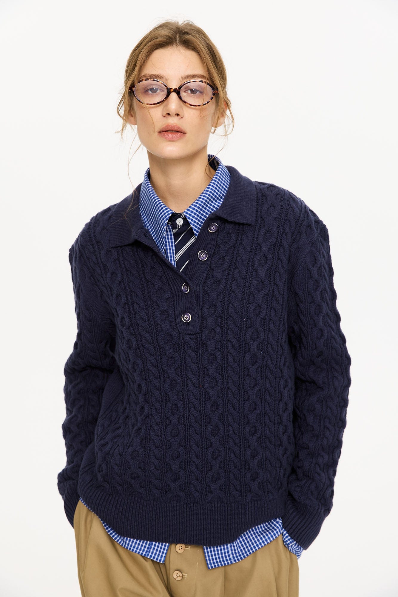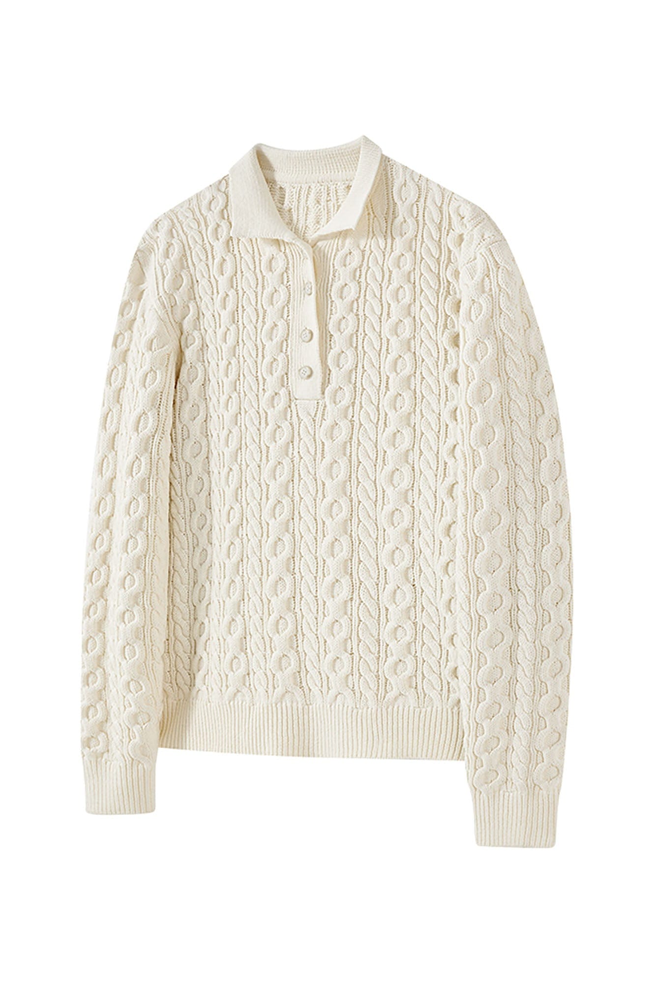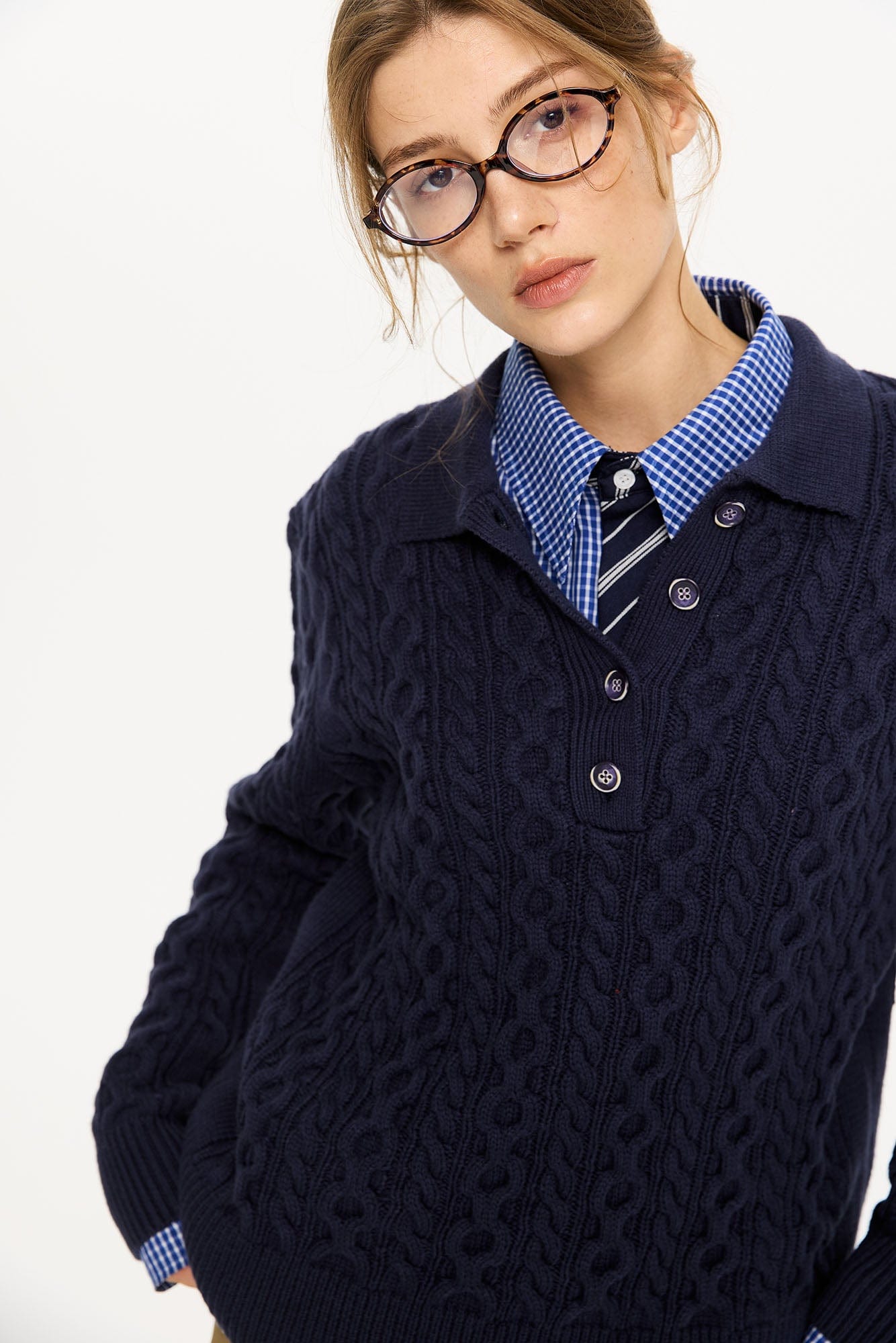 The Cable Knit Polo Sweater bridges collegiate references with a soft sculptural texture. Its traditional cable pattern is reimagined in a slightly oversized frame, anchored by a classic polo collar and buttoned placket. The premium knit construction offers dimensional richness, while ribbed edges at the cuffs and hem bring subtle structure. Understated yet elevated, it layers effortlessly into both relaxed and refined looks.