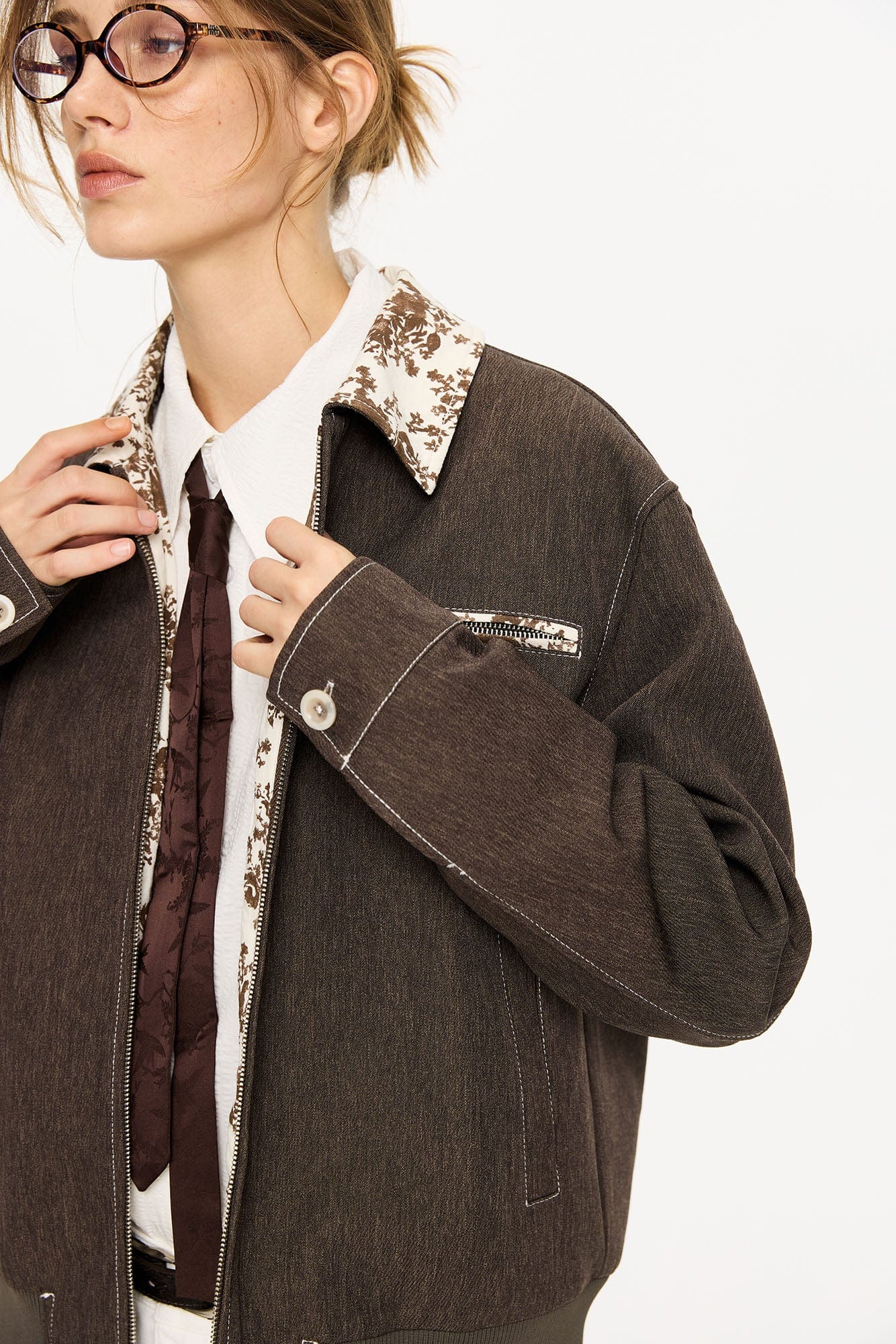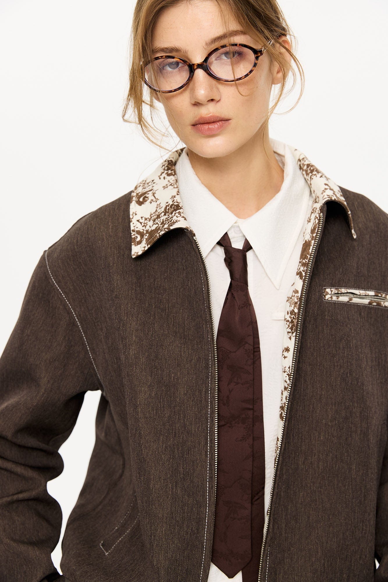 The Contrast Floral Collar Jacket juxtaposes utilitarian lines with romantic detailing in a fresh, contemporary silhouette. Crafted from premium fabric with a slightly oversized cut, this piece stands out for its contrast floral collar and matching trim along the chest pocket and interior lining. Available in two versatile colorways, it balances tonal body panels with crisp stitching and zip-front functionality. A fusion of refined construction and subtle eccentricity, it brings layered dimension to any streetwear rotation.
