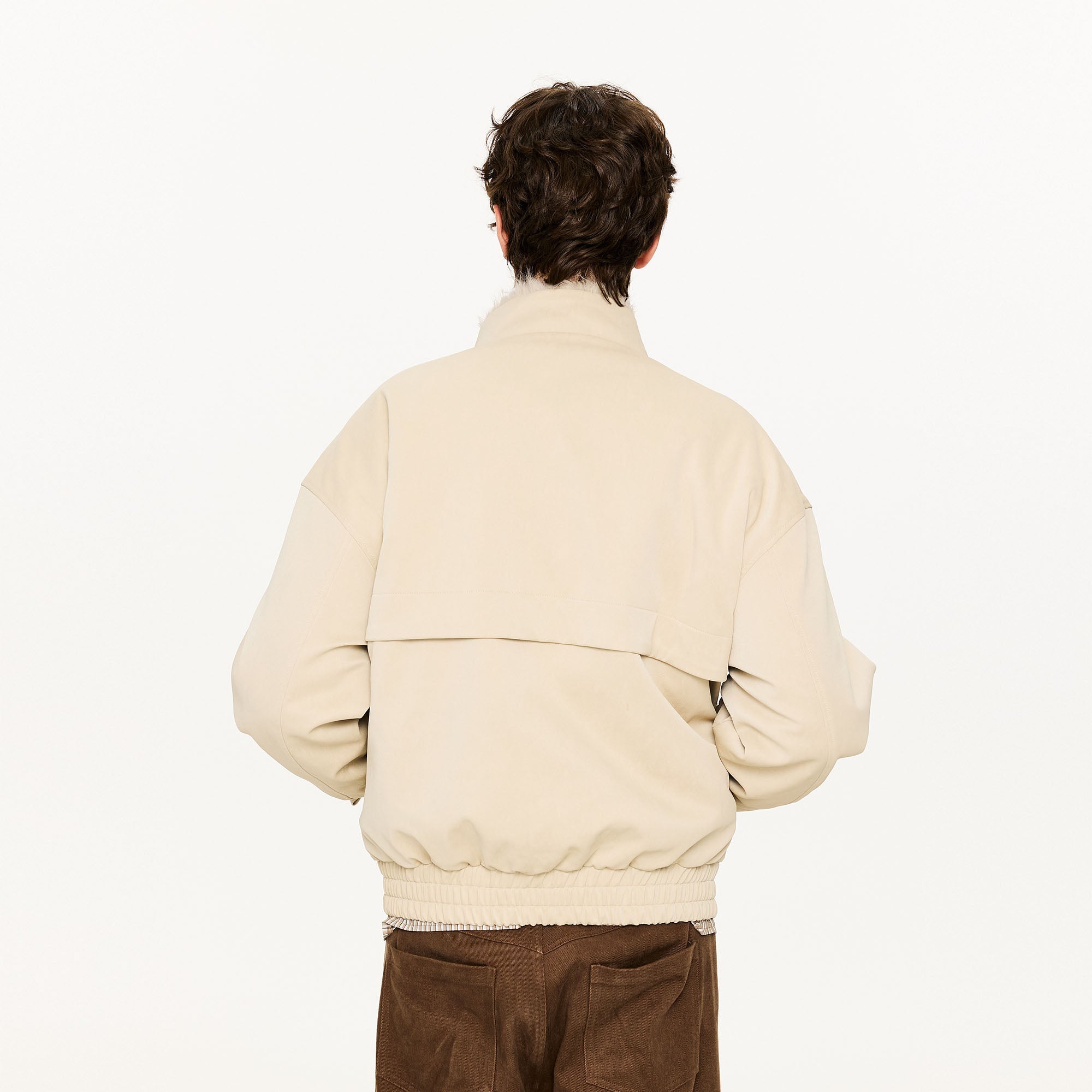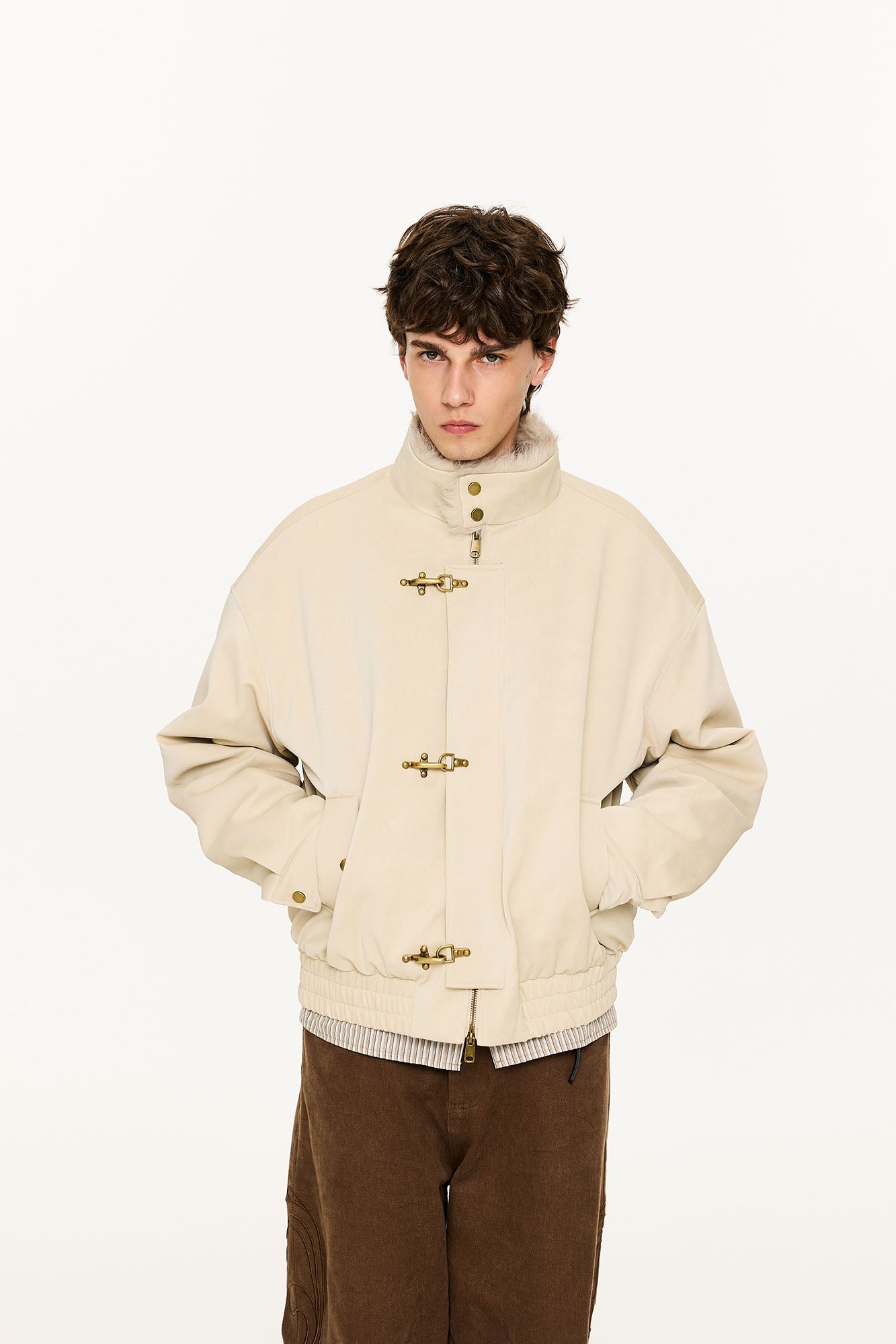 The Faux Fur Lining PU Jacket presents a fusion of rugged structure and refined warmth. Its smooth PU exterior contrasts with a plush faux fur lining that adds depth and visual texture. Detailed with custom toggle closures and metal hardware, the design nods to vintage aviation influences while maintaining a distinctly modern silhouette. Finished with an elasticated hem and oversized cut, this piece captures the essence of functional luxury.