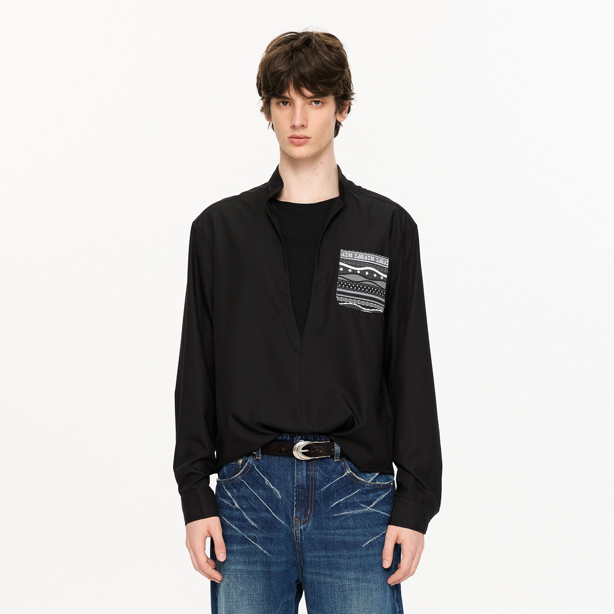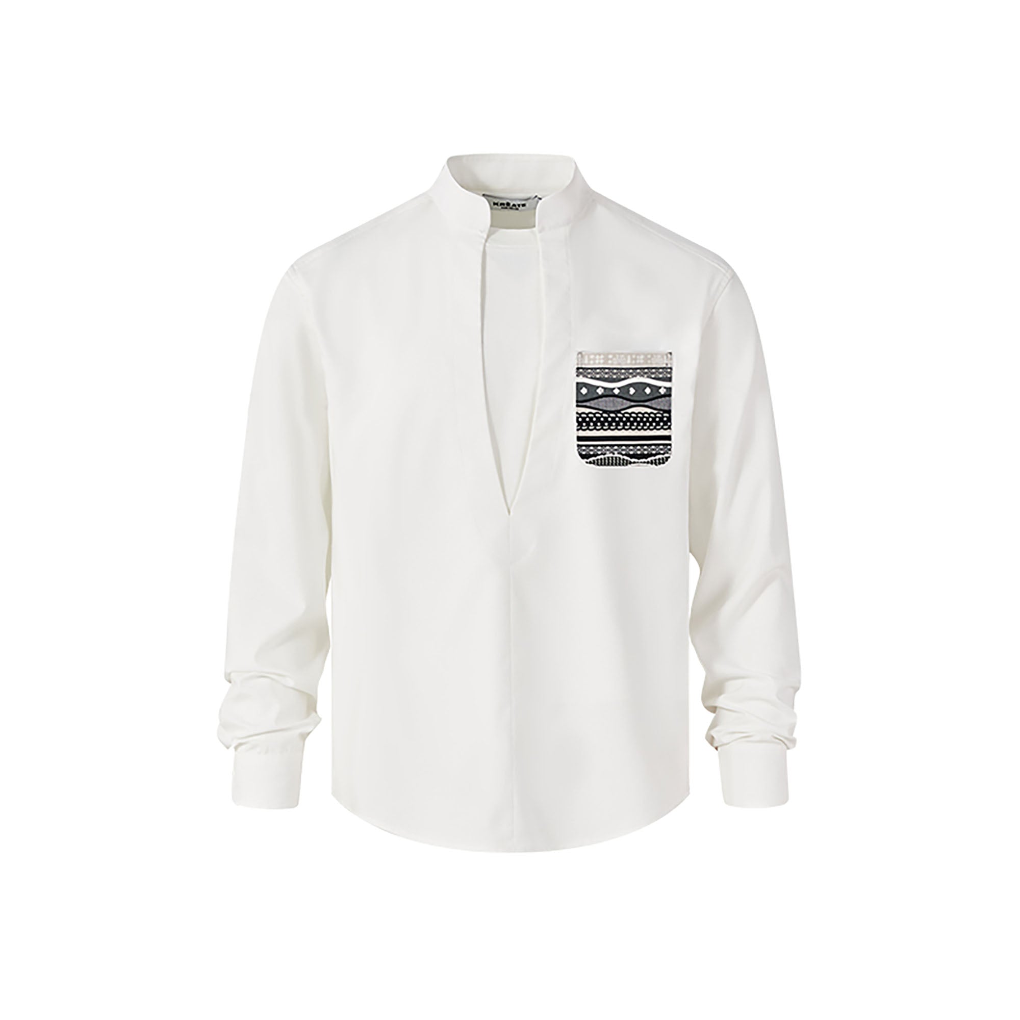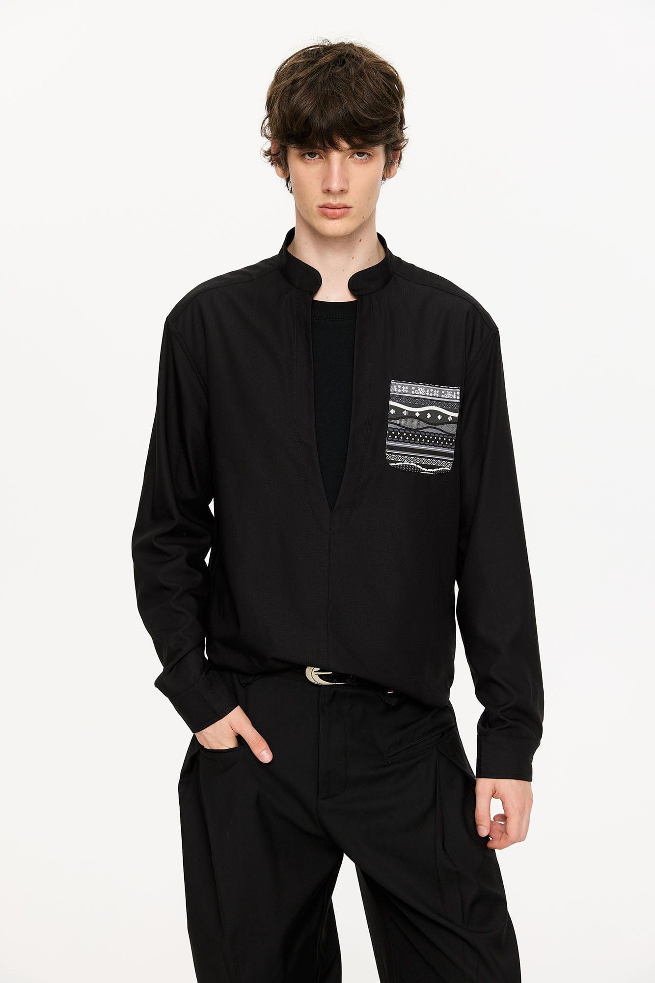 The Faux Layered Fair Isle Pocket Shirt blends minimal tailoring with a graphic heritage twist. Crafted from premium fabric and cut in a slightly oversized silhouette, the design features a deep split neckline framed by a sleek stand collar. A standout Fair Isle patterned patch pocket lends contrast and texture, creating the illusion of layered styling. Clean cuffs and a curved hem round out the crisp, modern finish.
