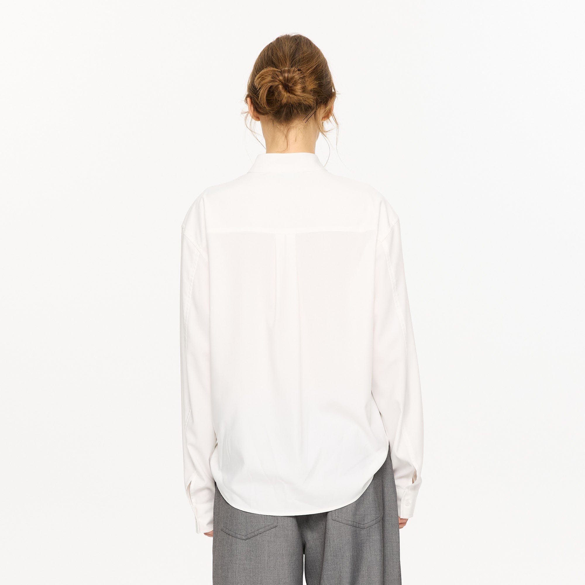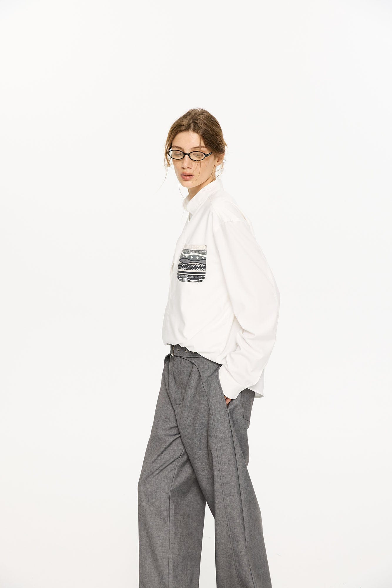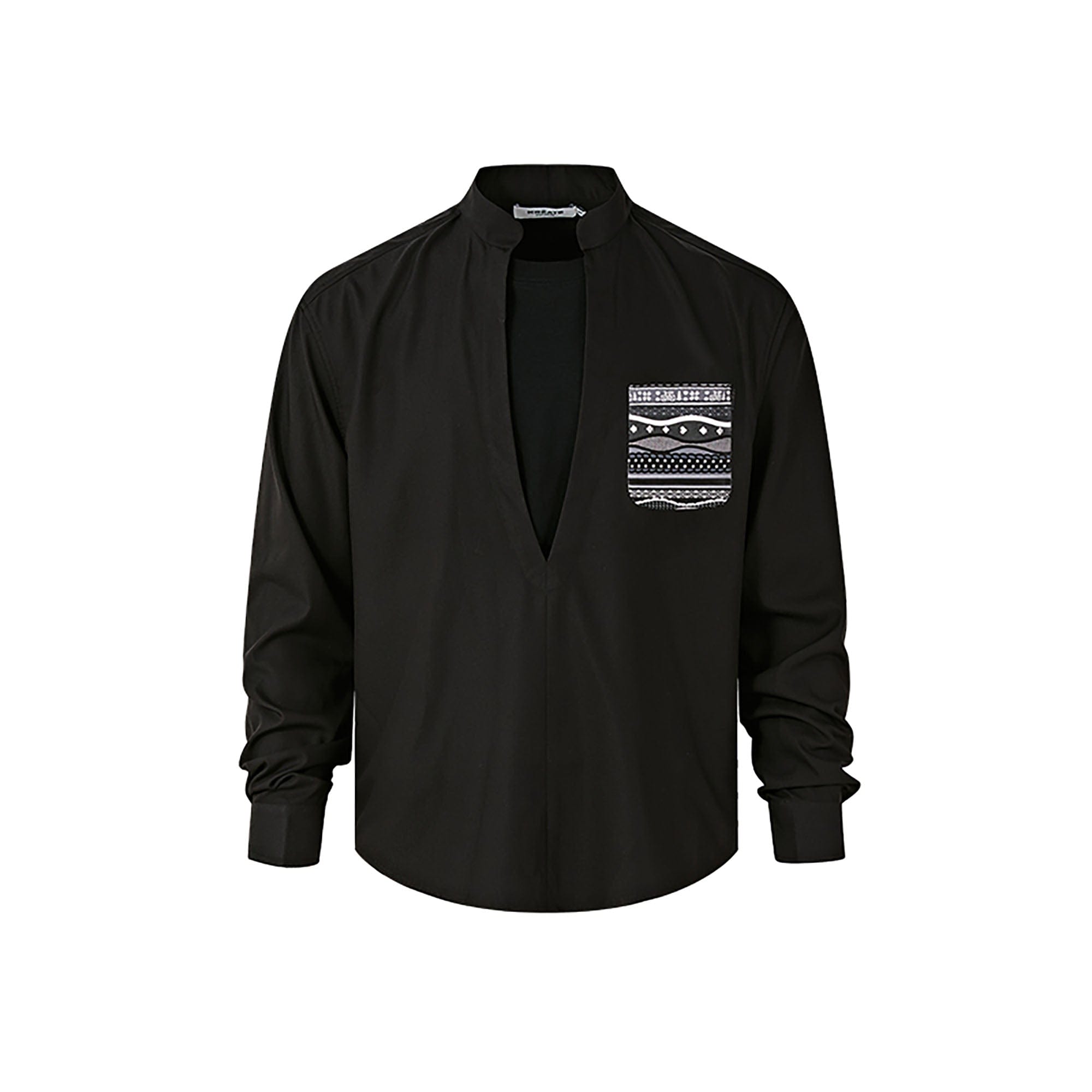 The Faux Layered Fair Isle Pocket Shirt blends minimal tailoring with a graphic heritage twist. Crafted from premium fabric and cut in a slightly oversized silhouette, the design features a deep split neckline framed by a sleek stand collar. A standout Fair Isle patterned patch pocket lends contrast and texture, creating the illusion of layered styling. Clean cuffs and a curved hem round out the crisp, modern finish.