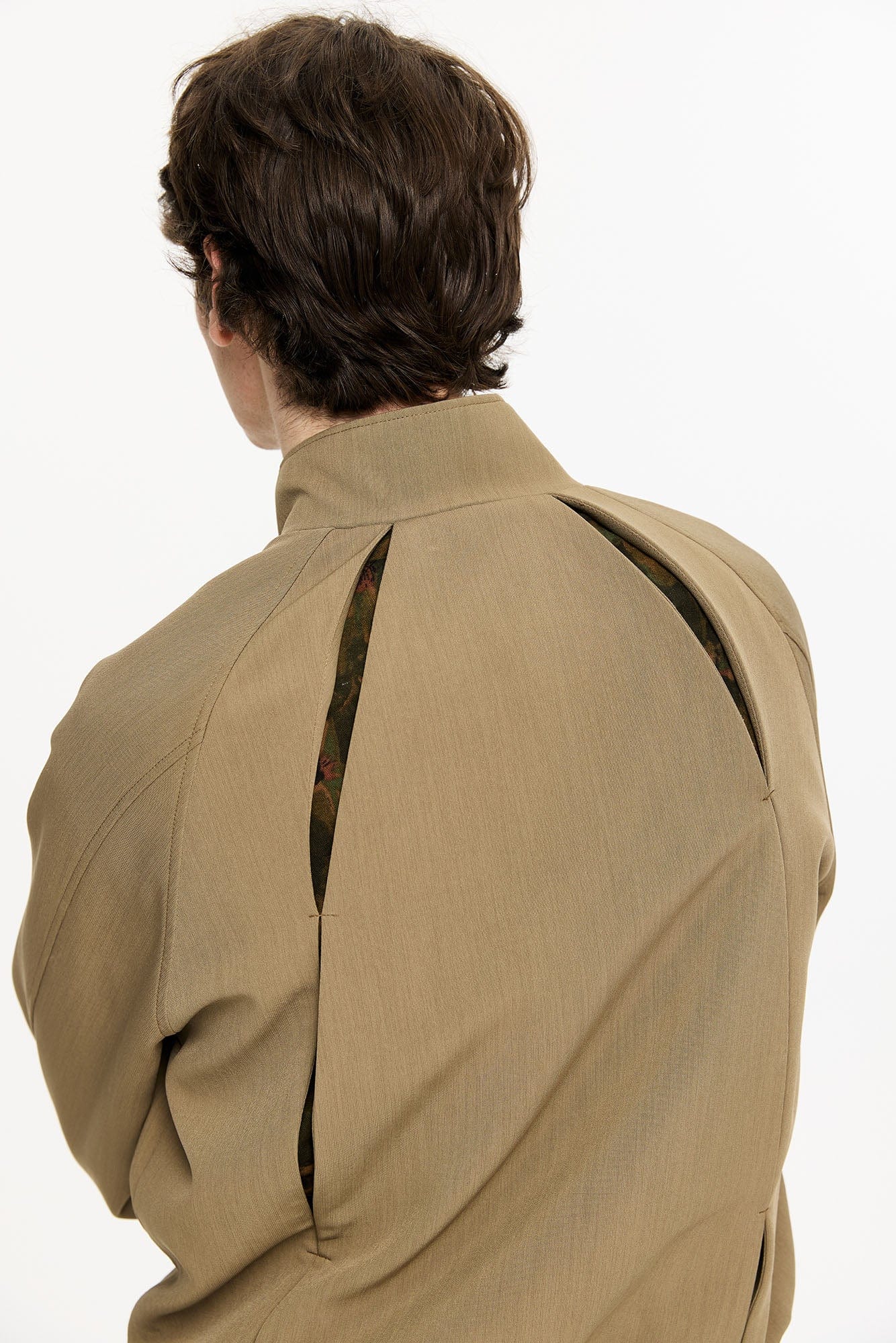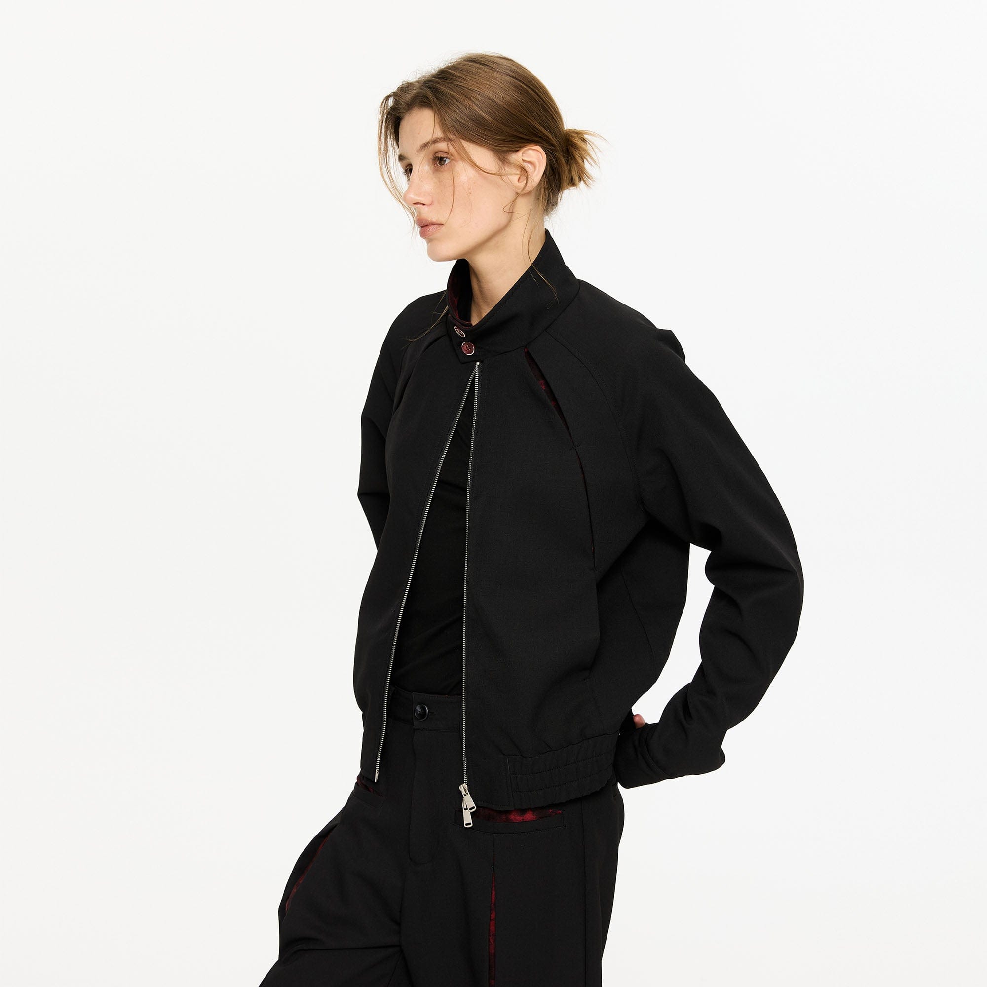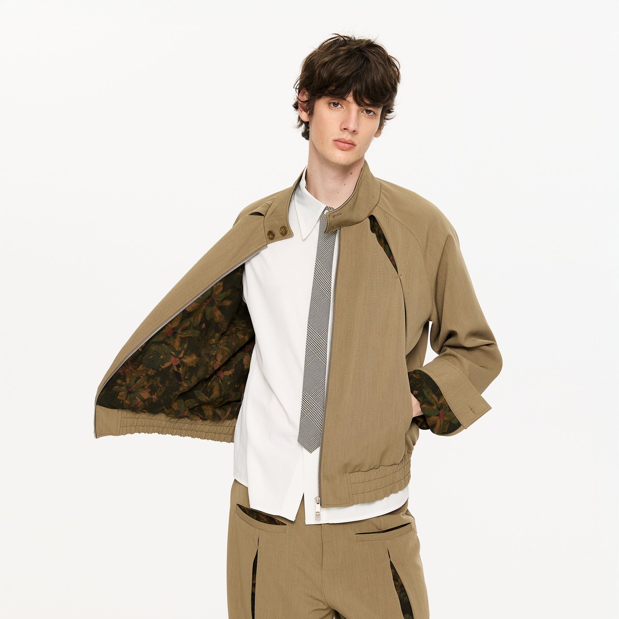 The Floral-Lined Spliced Harrington Jacket reinterprets a heritage silhouette through sharp construction and refined inner detailing. Made from premium fabric in a slightly oversized cut, the design features engineered splices along the front and back that reveal a floral-patterned lining beneath. With a stand collar, elasticated hem, and concealed side pockets, this piece bridges classic sportswear form with contemporary precision. Subtle stitching and tonal hardware complete the elevated execution.