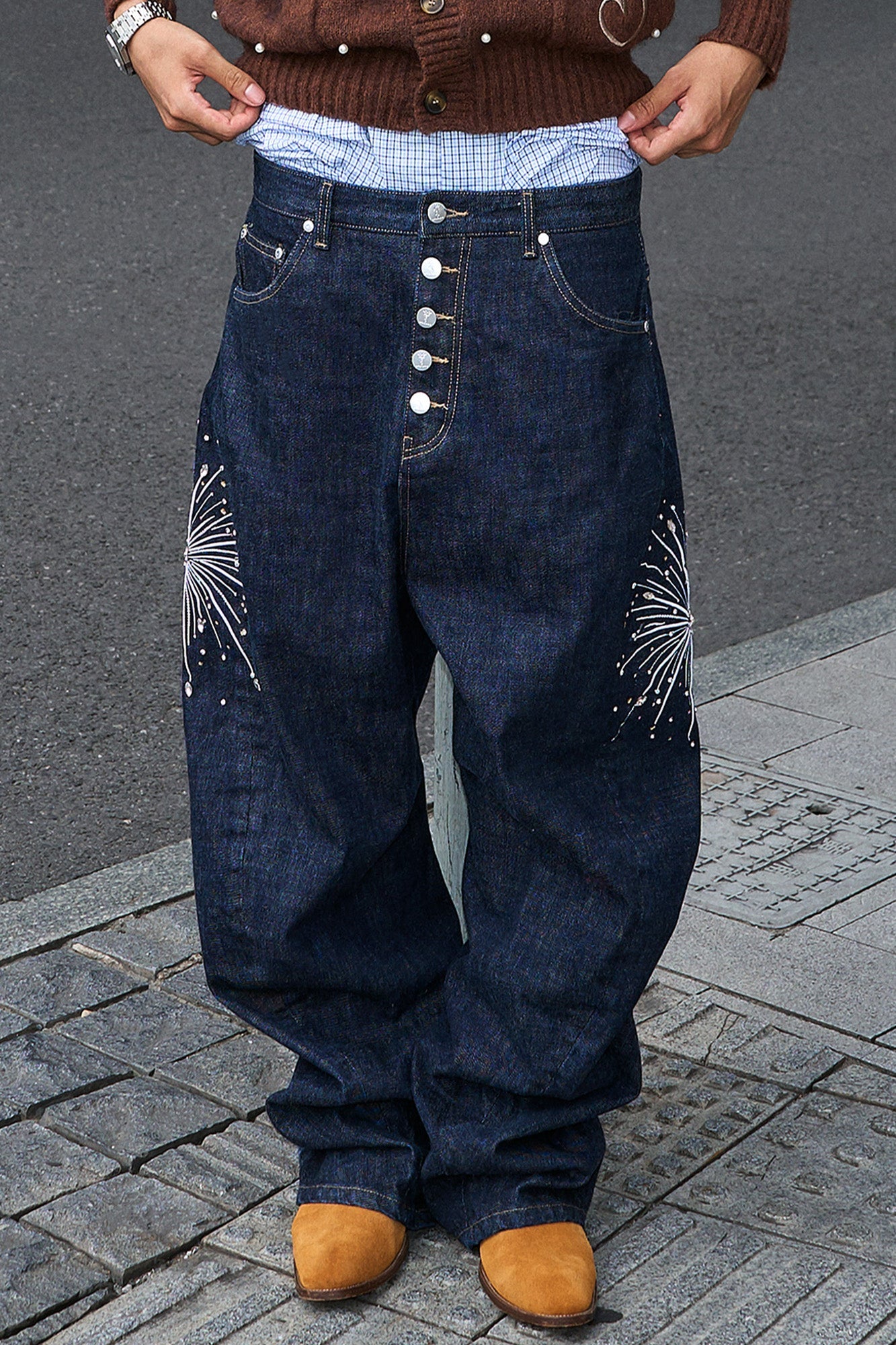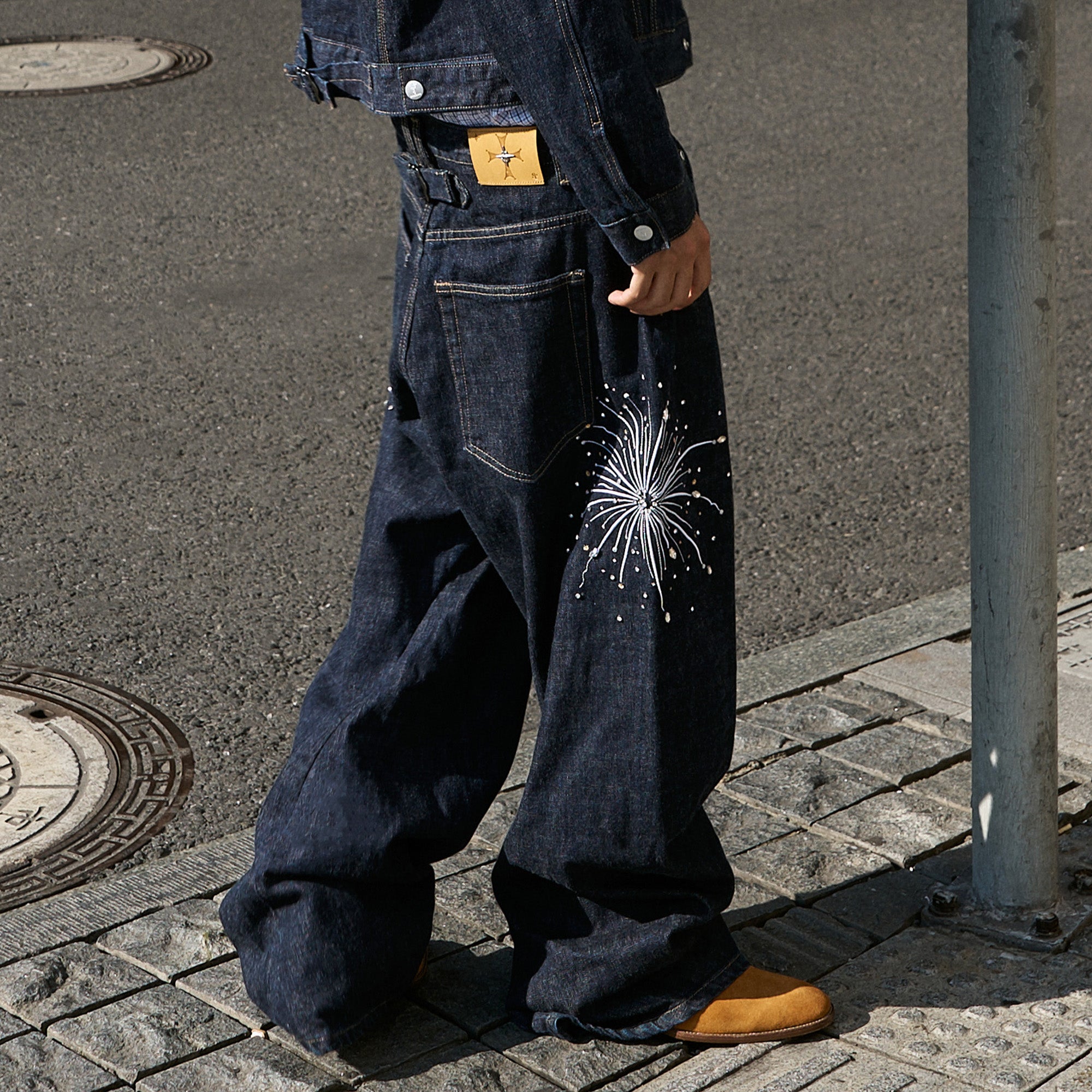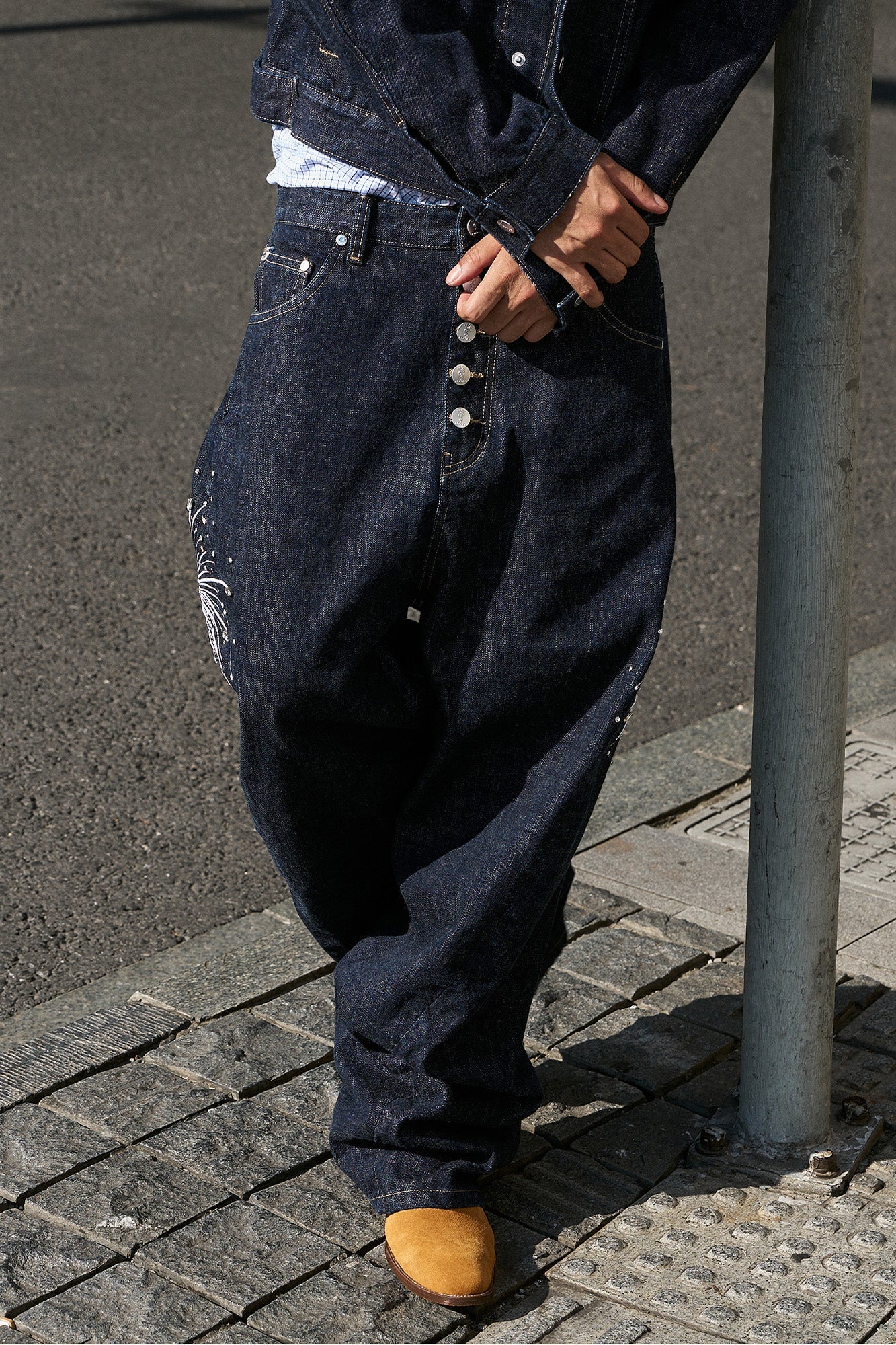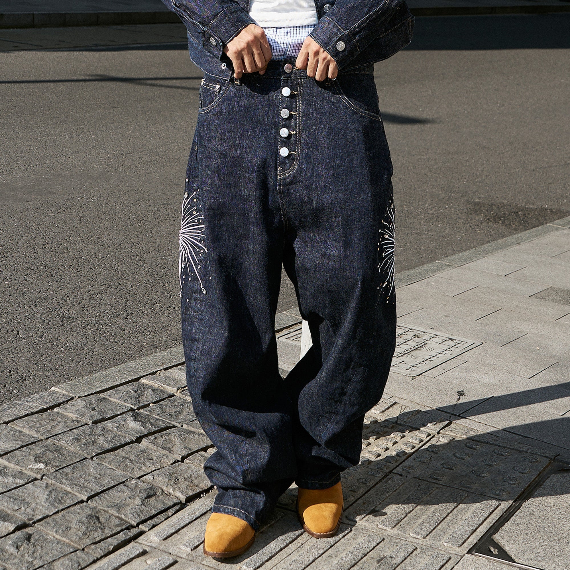 These raw denim jeans elevate a streetwear staple with bold embellishment, showcasing firework-inspired embroidery illuminated by rhinestone accents along the leg. The exaggerated wide-leg cut and curved silhouette bring volume and flow, while the deep indigo wash underscores their rugged base. A button-fly front and traditional five-pocket structure ground the design in classic denim craft. With their oversized proportions and radiant detailing, they merge workwear grit with celebratory flair.