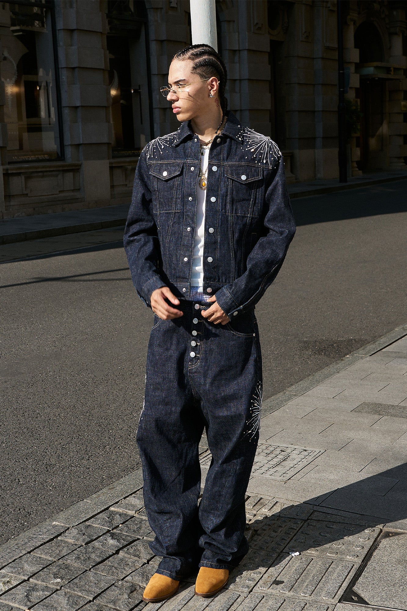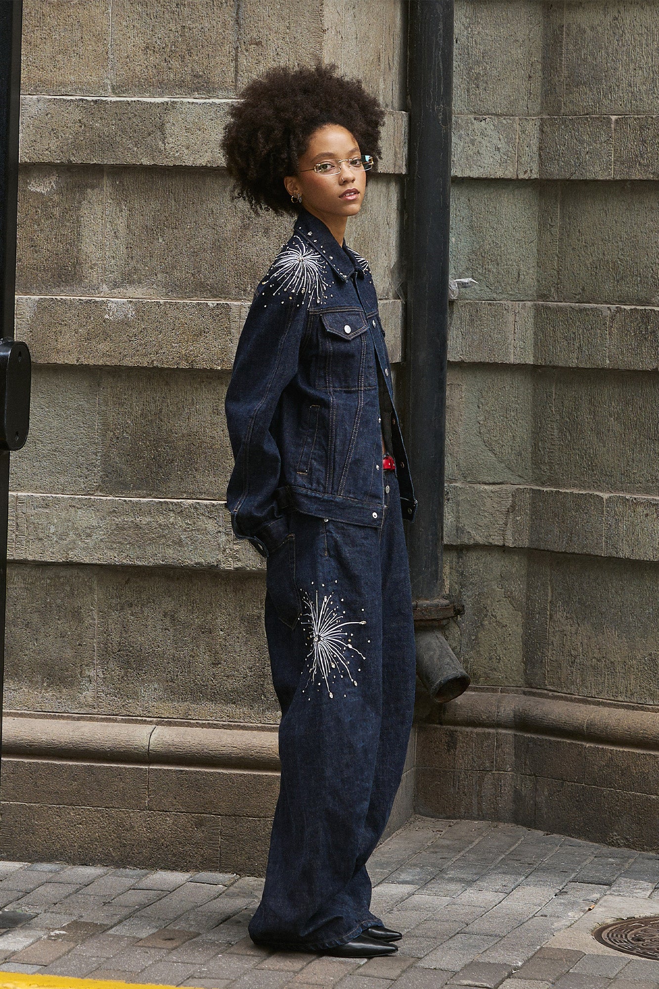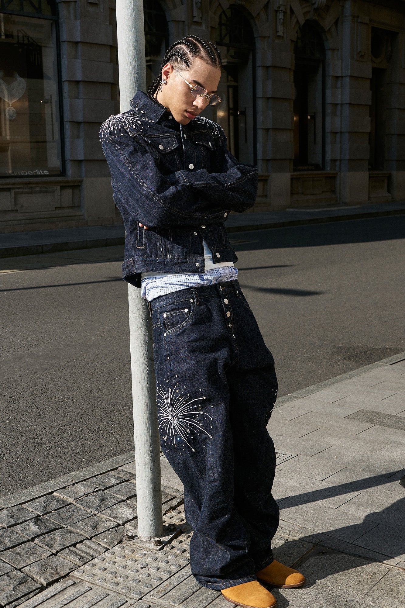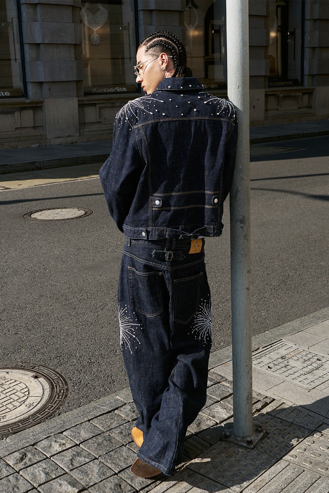 These raw denim jeans elevate a streetwear staple with bold embellishment, showcasing firework-inspired embroidery illuminated by rhinestone accents along the leg. The exaggerated wide-leg cut and curved silhouette bring volume and flow, while the deep indigo wash underscores their rugged base. A button-fly front and traditional five-pocket structure ground the design in classic denim craft. With their oversized proportions and radiant detailing, they merge workwear grit with celebratory flair.